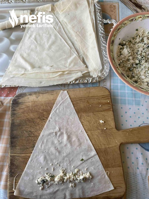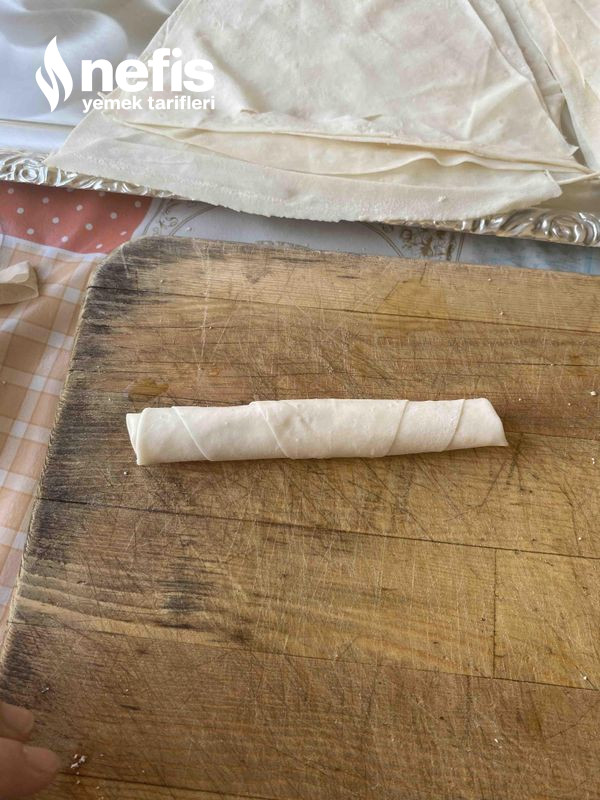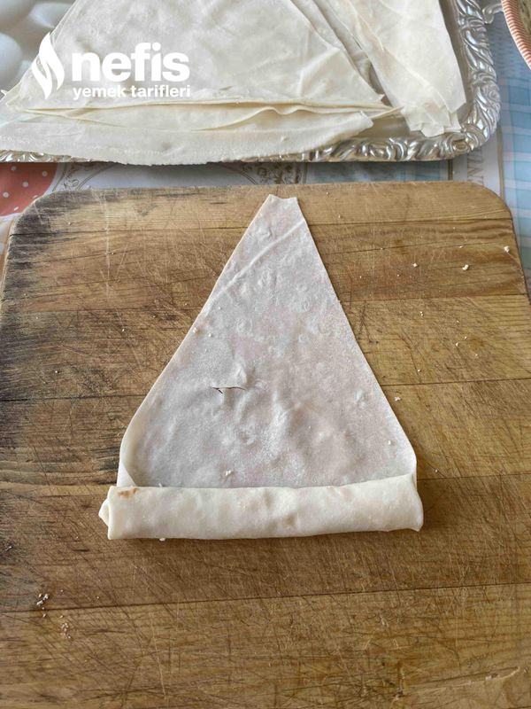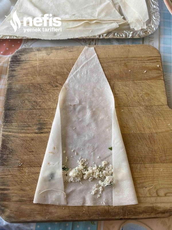 - Yufkanın geniş kısmına yarım kaşık harçtan koyun kenarlardan kıvırıp sarın ve ucunu ıslatıp kapatın.