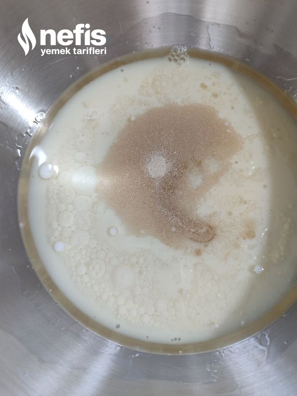 - İlk olarak ılık süt, ılık su, şeker ve maya karıştırılır. (5-10 dakika maya aktive olması beklenir).