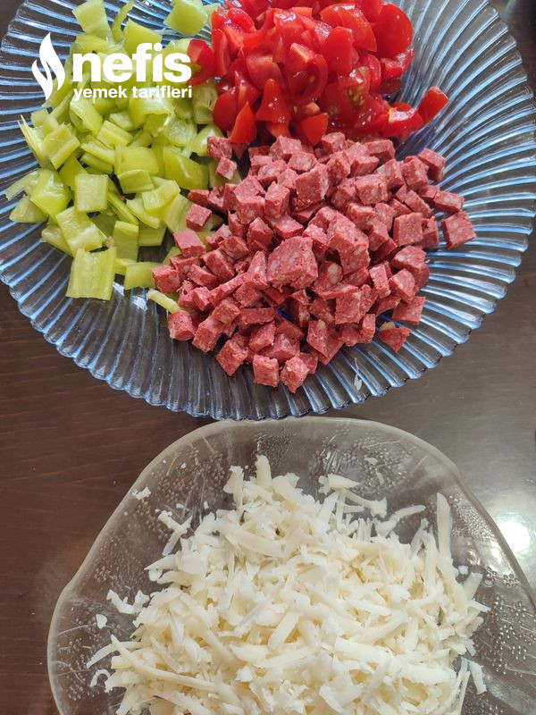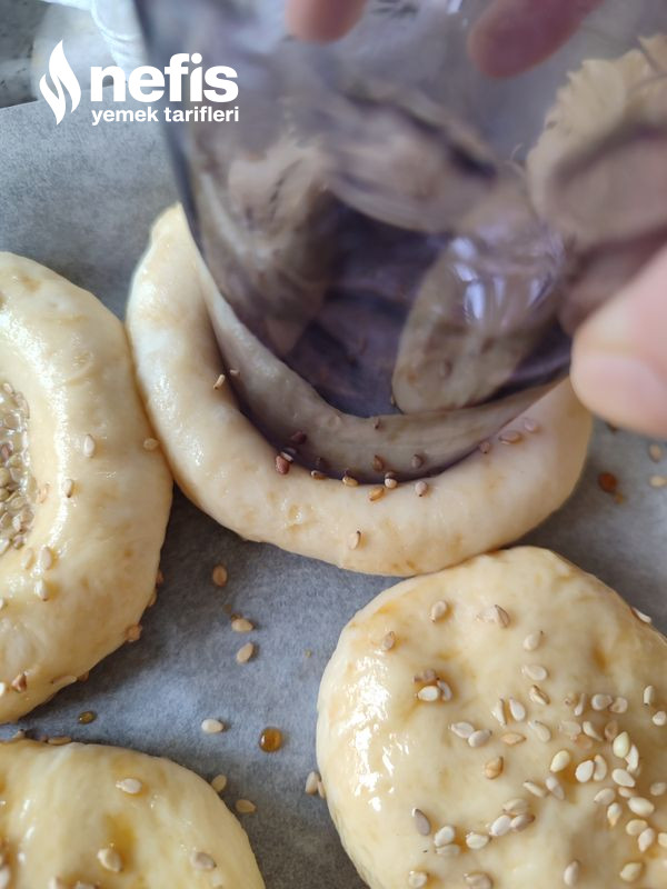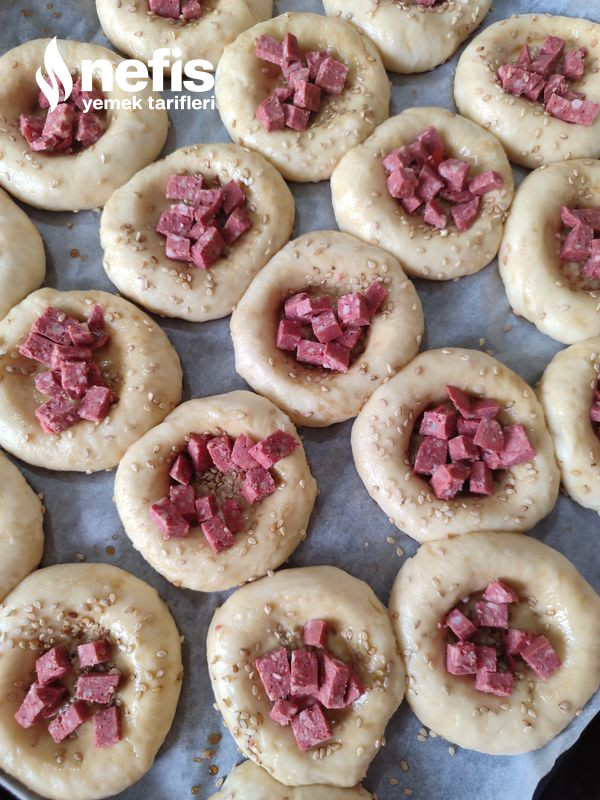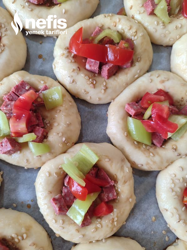 - Hamura susam serpilir. İstediğiniz gereçler çay bardağı ile açılan çukura sucuk, domates, biber ve kaşar eklenir.