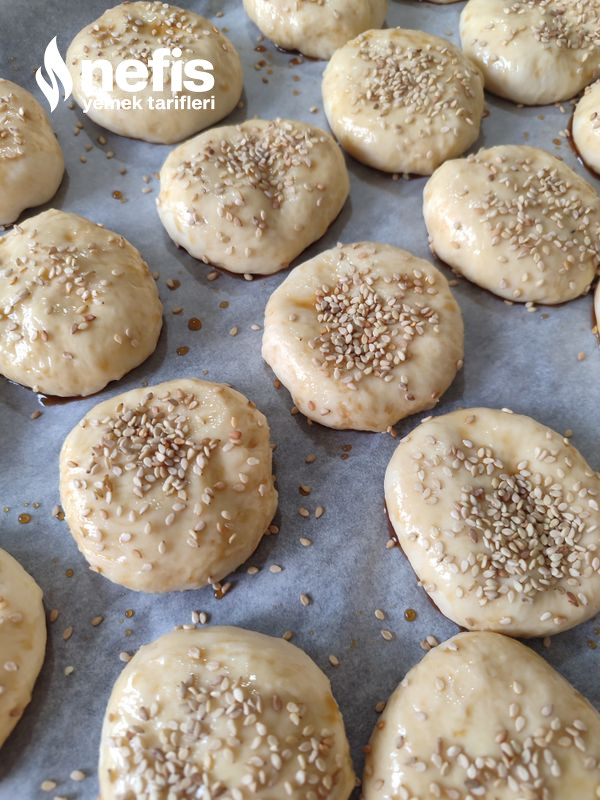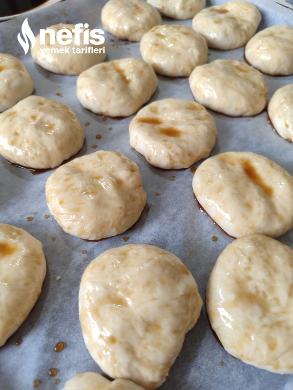 - Küçük küçük ayrılmış hamurlara su bardağı ile bastırılır ve pekmez+su karıştırılarak hamur üzerine fırça ile sürülür.