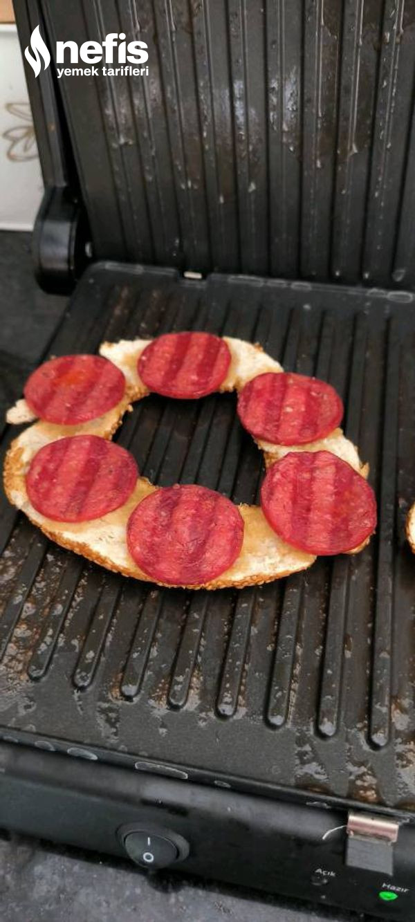 - Simidin bir yüzeyine dilimli sucuklar yerleştirilir.
