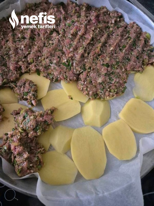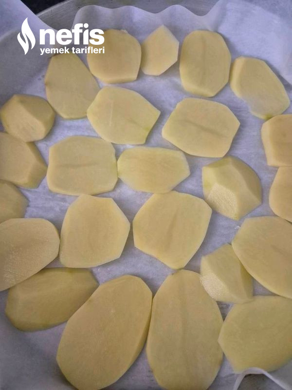 - Patatesleri soyduktan sonra ince dilimleyerek tepsinin altına yerleştirelim.