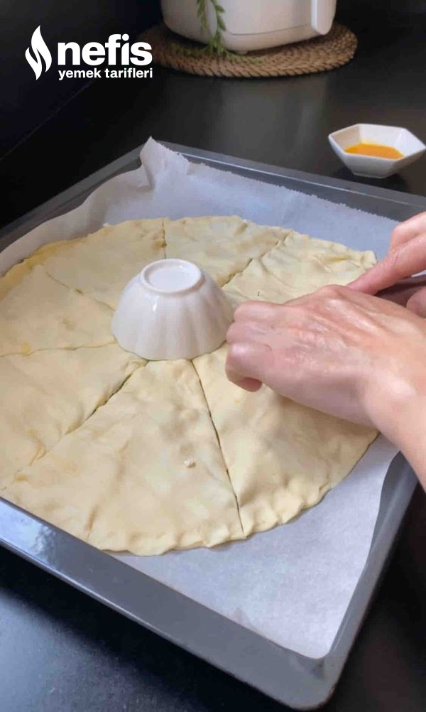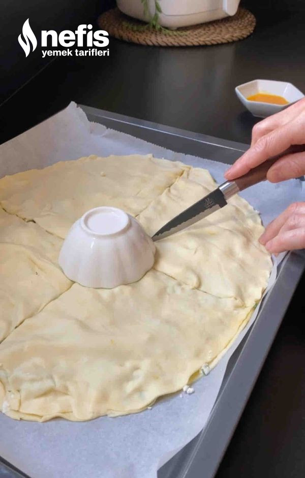 - Hamurun tam göbeğine bir küçük kase yerleştirip, hizalı bir formda keselim.