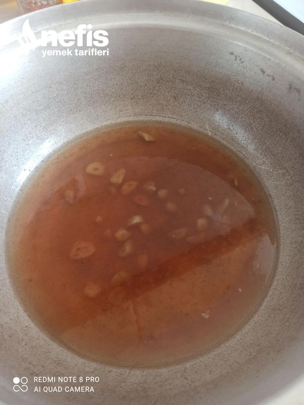 2. Büyük bir tencereye sirke, sıvı yağ, şeker, sarımsak, ve tuzu koyup kaynatın.