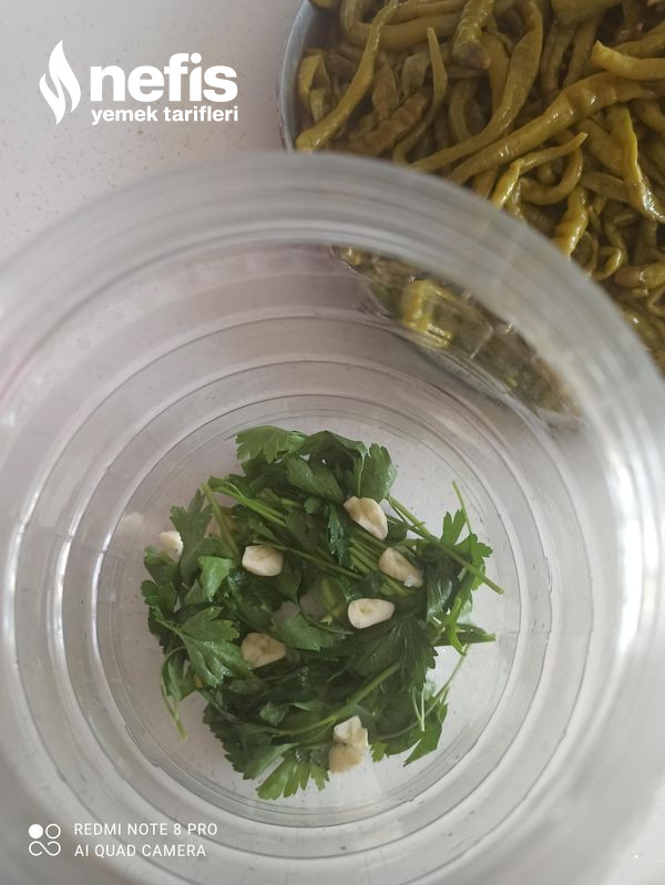 6. Bidonun tabanına isteyen maydanoz koyabilir. Aroma verir. Biberleri bidona bastırmadan dolduralım. Orta ara tekrar sarımsak atabilirsiniz.
