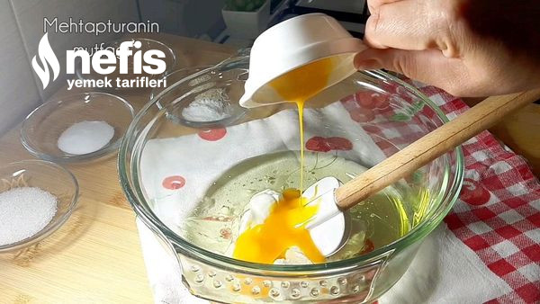 - Yoğurma kabına öncelikle yoğurdu sıvı yağını yumurta sarısını kabartma tozu mahlep sirke şeker ve tuzu alıp tuz ve şeker eriyinceye kadar ve bütün materyal birbirine geçene kadar karıştıralım ve sonra unu eklemeye geçelim öncelikle bir bardak unu ekliyor ve karıştırıyorum.