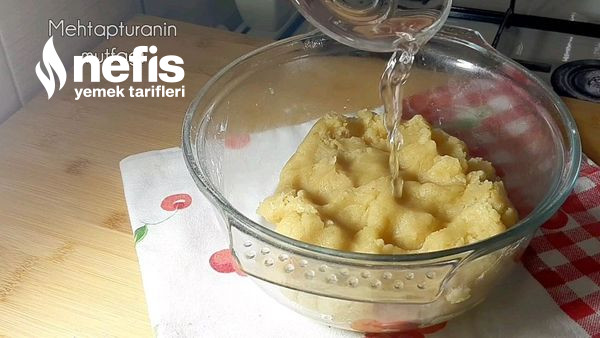 - Geriye kalan unu da yavaş yavaş ekledikten sonra ele yapışmayan yumuşak kıvamda bir hamur elde edelim. Bu evrede suyu ek edeceğiz suyu ekleme nedeni hamur katı yağsız olduğu için kırılgan kıvamda oluyor. Kolay hal alabilmesi için suyu ekliyoruz.
