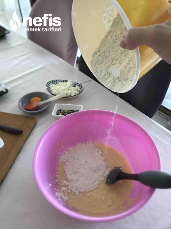 1. Öncelikle bir kabın içine; yoğurt, sıvı yağ, yumurta, şeker, tuz, kabartma tozu,üzerine limon suyu sıkılmış karbonat, mısır unu konur ve spatula ile güzelce karıştırılır.