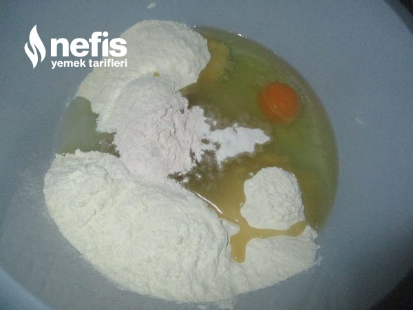 - Derin bir kaba unu koyalım. Ortasını havuz yapalım, öbür materyalleri ortasına koyalım. İki dk orta kısmını çırpıcı ile çırpalım, sonra unu toplayarak kulak göğsü yumuşaklığında bir hamur elde edelim.