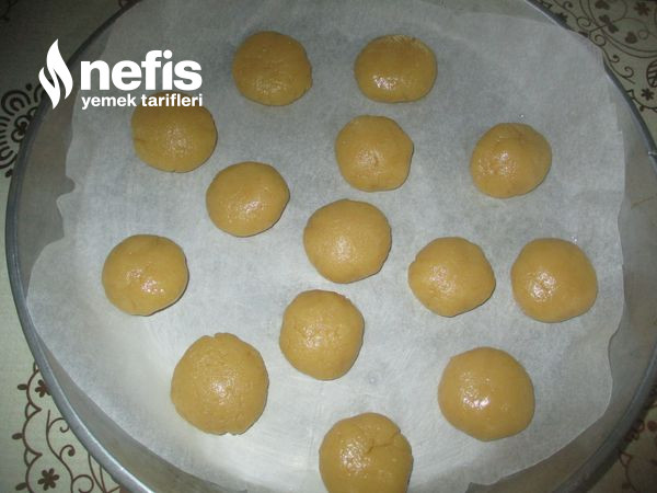- Hamurdan cevizden az büyük kesimler kopararak yuvarlayalım, hafif bastıralım. Yağlı kâğıt serilmiş tepsiye dizelim.
