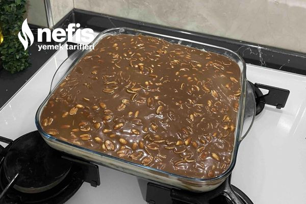 - En son fıstıklar eklenerek pastanın üzerine dökülür.