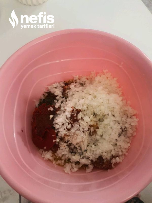 2. Başka bir kapta kıyma, kaynar su da yıkanan pirinç, nar ekşisi, baharatlar, yemeklik doğrayın kuru soğan, zeytinyağı, domates ve biber salçasını koyup elimle güzelce yoğuruyorum.