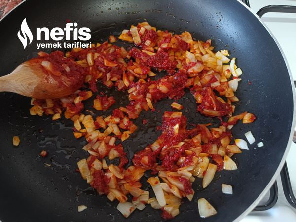 3. Kuru soğan pembeleştikten sonra salçamızı ekleyelim ve bir süre kavuralım.
