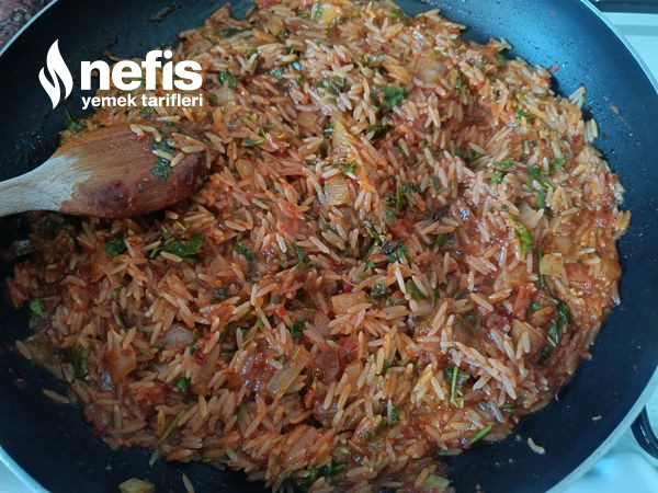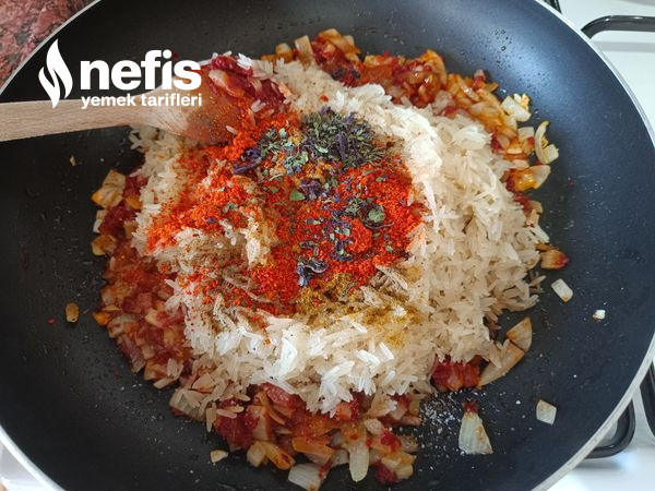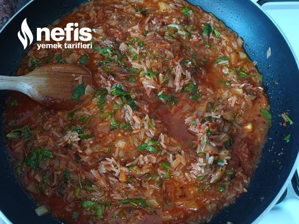 4. Daha sonra pirinçi ve baharatları tuzu ek edip tekrar karıştıralım. Sıcak suyu ekledikten sonra maydanozu da ek edip tencerenin ağzını kapatalım ve suyunu çekene kadar pişirelim.