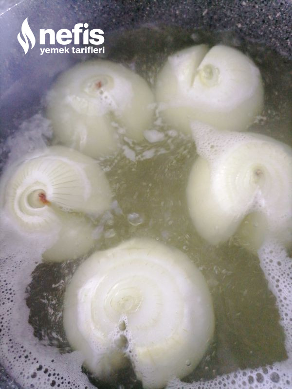 - Su kaynamaya başladığı vakit soyduğumuz ve soğanın ortasını geçmeden dikine bir kesik atalım bu süreci bütün soğanlar için başka ayrı yapalım. Yaklaşık kaynayan suyun içinde 10-15 dakika haşlayalım.