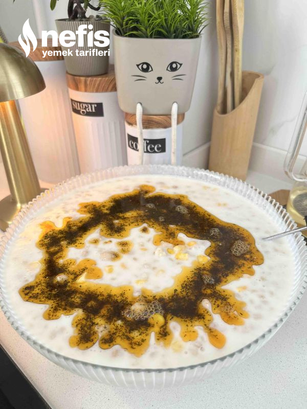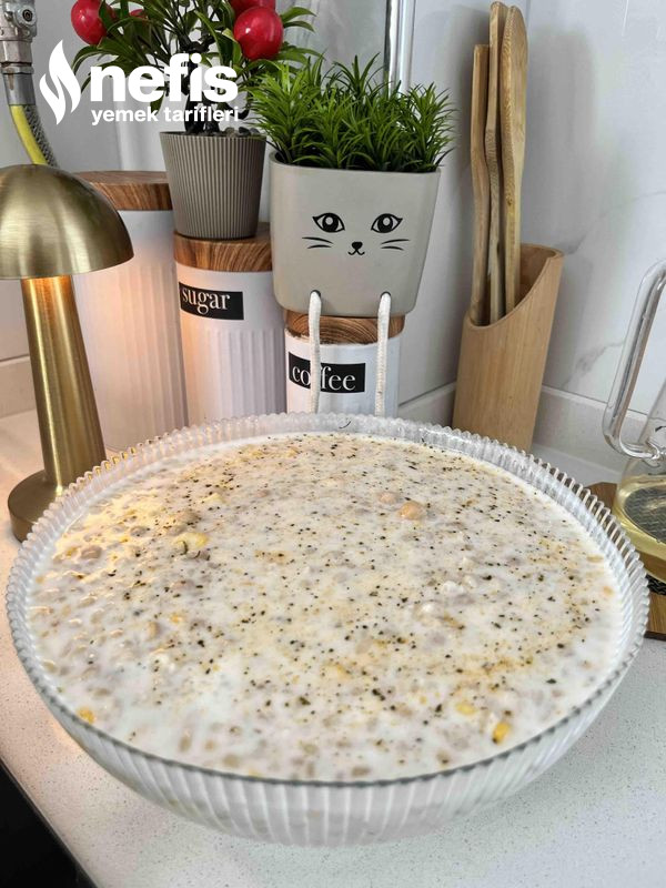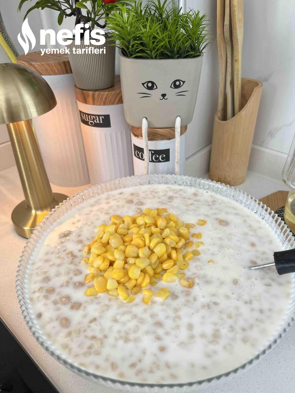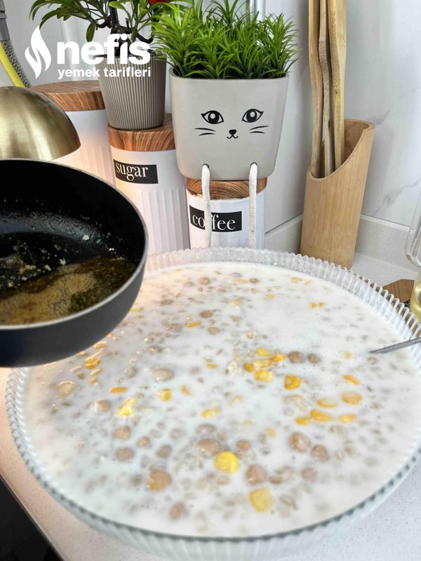 - Haşlanmış buğday, nohut ve mısırı yoğurt karışımına ek edin.