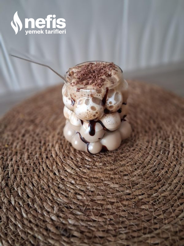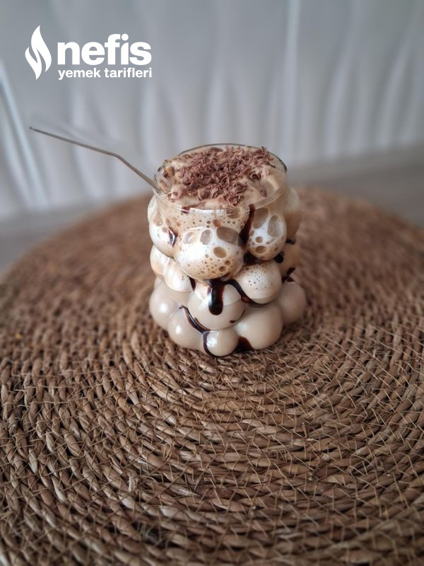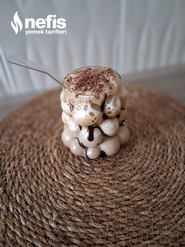 - Çırpama süreci bittikten sonra bardağımızı çikolata sosuyla süsleyelim, en alta buzlarımız koyalım, üstüne kahvemizden 2-3 tatlı kaşığı ekleyelim kahvenin üstüne bardağım yarısına gelecek kadar süt ekleyelim geriye kalan kahvemizide sütun üstüne ekleyelim.