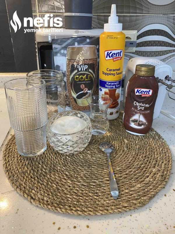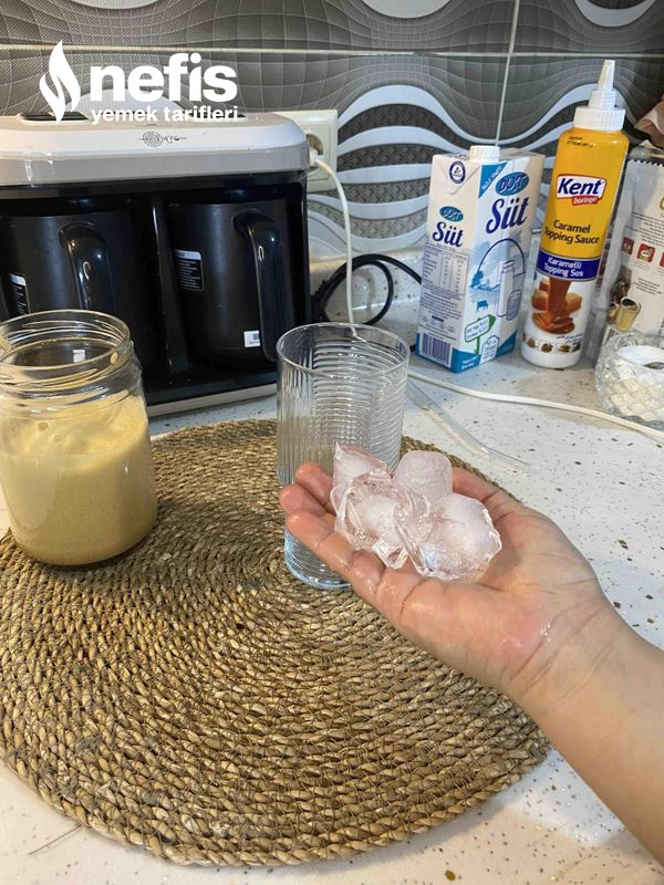 - Bir bardağın içerisine buzlar konulur bardağa karamel ve çikolata sosu ile süsleme yapılır.