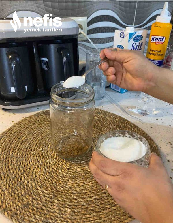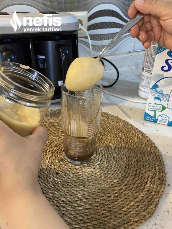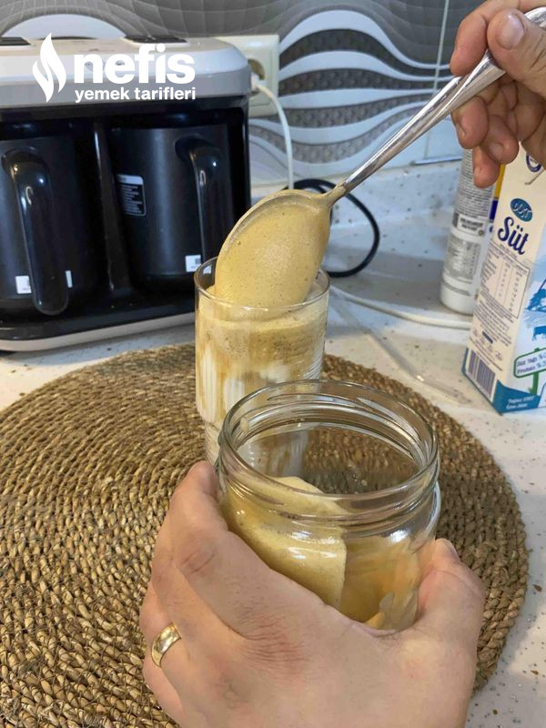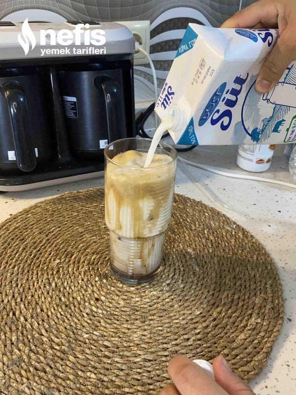 - Üzerine yapılan kahveden 2 yemek kaşığı konulur ve süt eklenir.