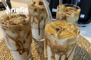 - Bir bardağın içerisine buzlar konulur bardağa karamel ve çikolata sosu ile süsleme yapılır.