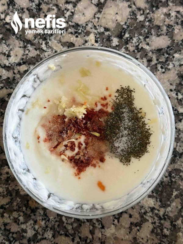 - Yoğurdun üzerine tuz ve baharatları ekleyelim, sarımsağı rendeleyip üzerine ek edelim.