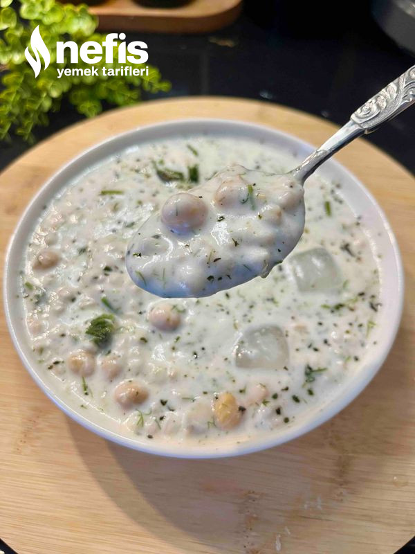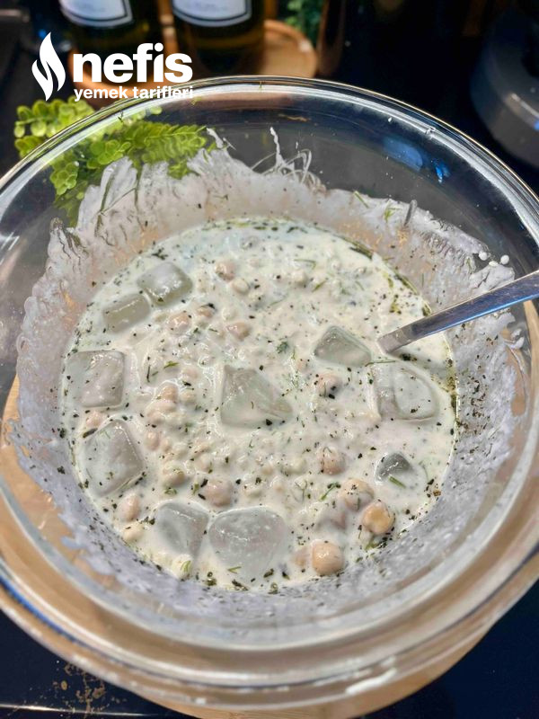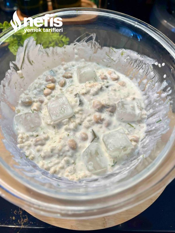 1. Yoğurdu karıştırma kabına alıp karıştırın üzerine haşlanmış, buğday, nohut, tuz ve kıyılmış dereotu ekleyip karıştırın.