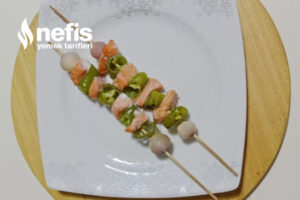 - Çöp şişlere sırasıyla bir adet arpacık soğan bir dilim somon bir yeşil biber somon yeşil biber toplamda 4 adet yeşil biber 4 adet somon dilim ve en son yeniden bir adet arpacık soğan dizin arpacık soğan bir başta bir de sonda olacak.