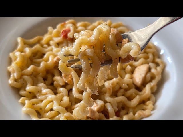 - Krema ekleyelim ve kaynayan makarnadan yarım bardak makarna suyu ayıralım ve sosa dahil edelim. Makarnayı süzdürelim.