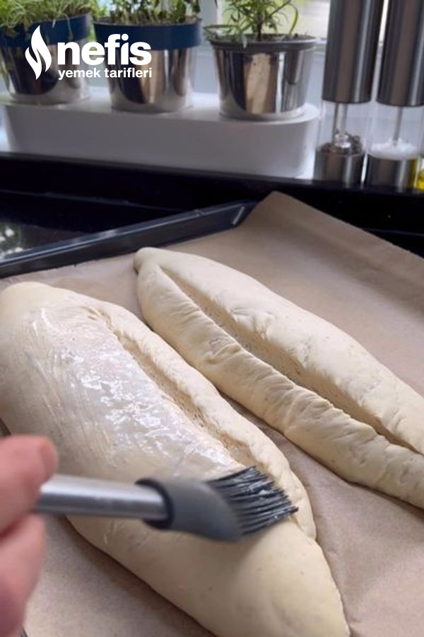 - Mayalanmış hamurların kenarını üstten aşana keskin bir bıçakla kesip, üzerine yoğurt ve su karışımını sürün.