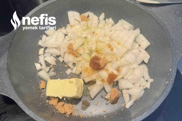 - Soğanları karamelize edin: tereyağında soğanları yumuşayana kadar kavur, esmer şeker ve sirkeyi ekle. Altın renk alana kadar pişirin. Soğumaya bırakın.