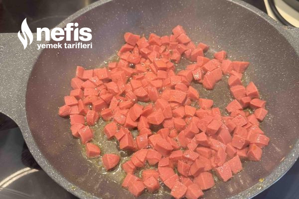 - Sosisleri kızart: hafif yağda yalnızca dışını mühürleyin. İçleri fırında pişecek.