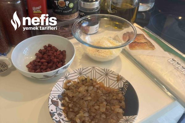 - İç harcı yerleştir: üzerine 1 tatlı kaşığı karamelize soğan koyun. Üstüne sosis yerleştirin. Peynir karışımını (taze kaşar + parmesan) ve kekiği serpiştirin.