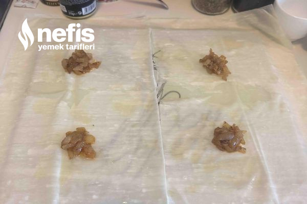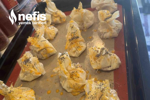 - Bohça biçiminde kapat: yufkanın dört ucunu üstte toplayıp bohça üzere büzün. Yeşil soğan sapı yahut mutfak ipiyle bağlayabilirsiniz.