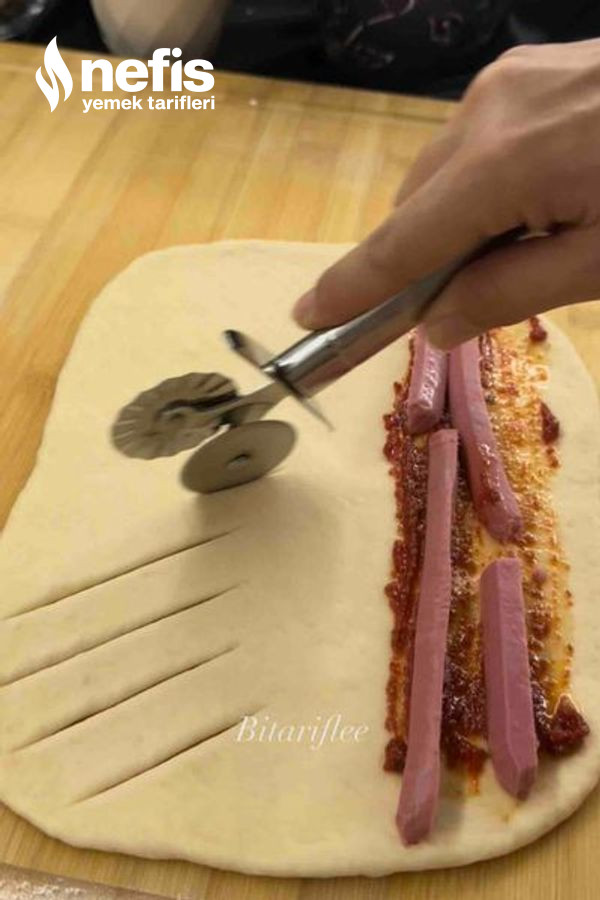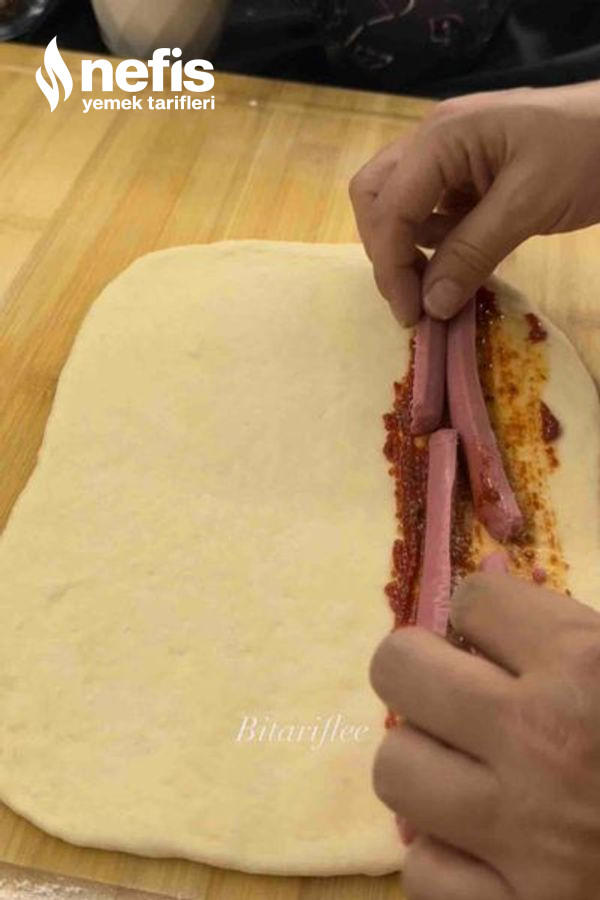 - Bir ucuna salça sosu sürüp üzerine sosisleri ek edelim.
