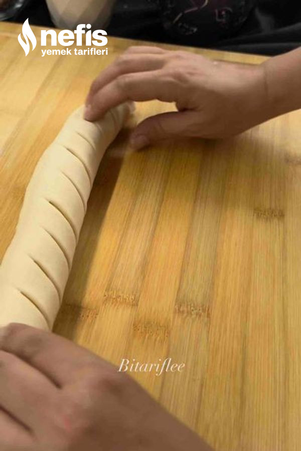 - Diğer uç kısımlarını bıçak yardımıyla birer parmak aralıklı olacak biçimde 5-6 cm uzunluğunda verev keselim ve iç koyduğumuz kısımdan başlayarak gevşek olmayacak biçimde saralım, tepsiye yerleştirelim.