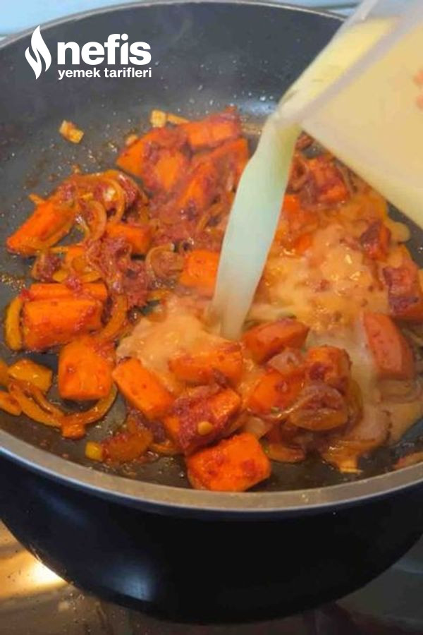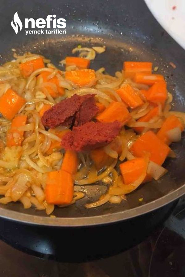 3. Aynı tavanın içine yarım ay halinde doğranmış soğan ve sarımsakları ek edin üzerine iri doğranmış havuçları ekleyip soteleyin salçaları ekleyip kokusu çıkana kadar kavurun.