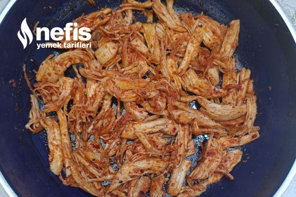 5. Yağ kızarmdan tiftiklediğimiz eti tavaya alıp üzerine hazırladığımız salçalı baharatı ekleyip yakmadan kızartalım.