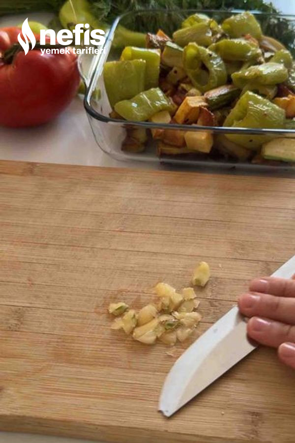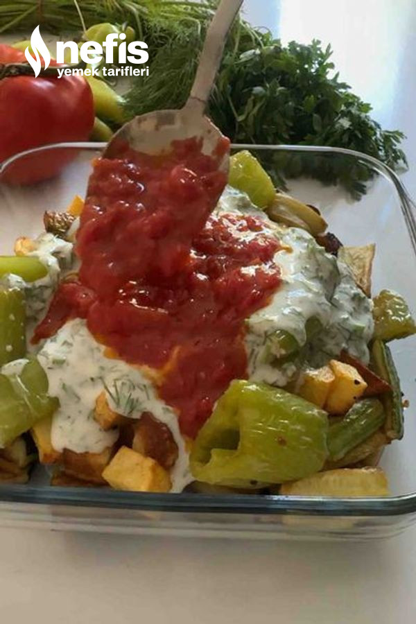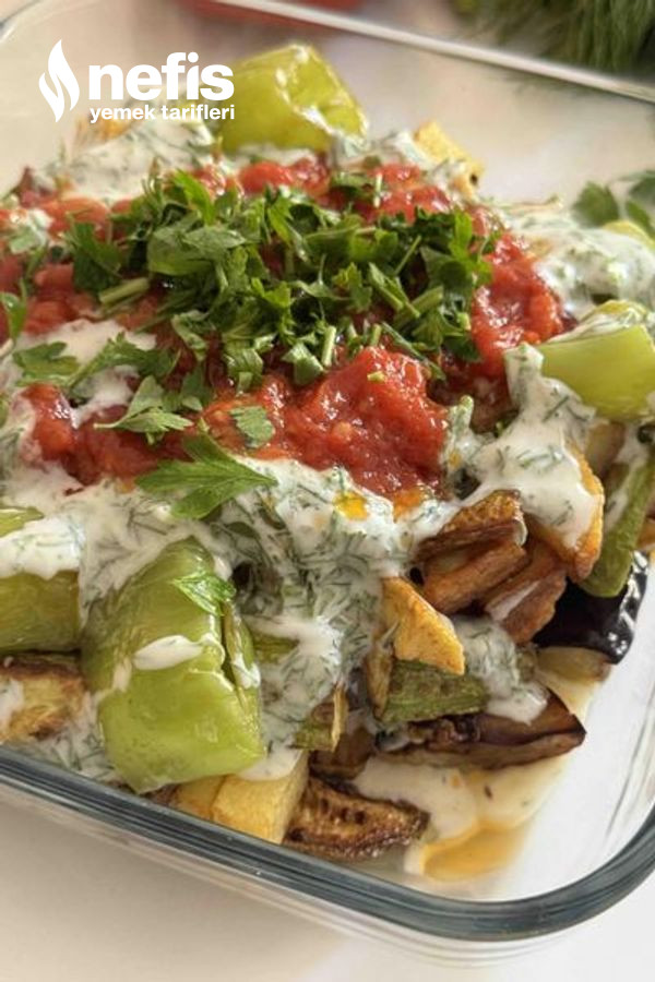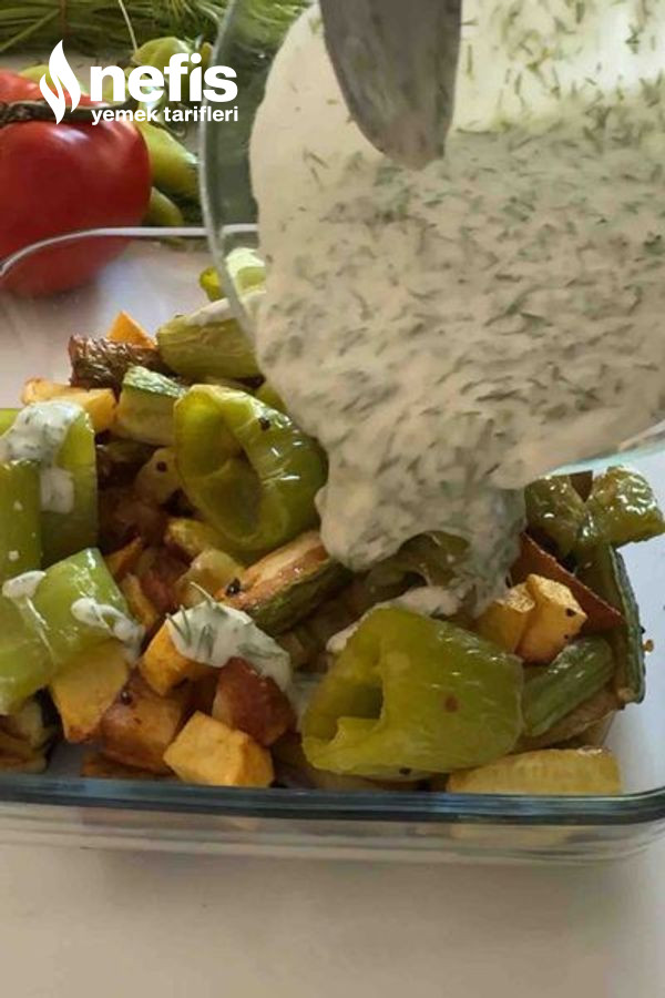 - Sebzeleri bir kaba aktaralım ,önce üzerine yoğurtlu sosu daha sonra domatesli sosu döküp bir lezzet şöleni ile kendinizi ödüllendirebilirsiniz 🥰.