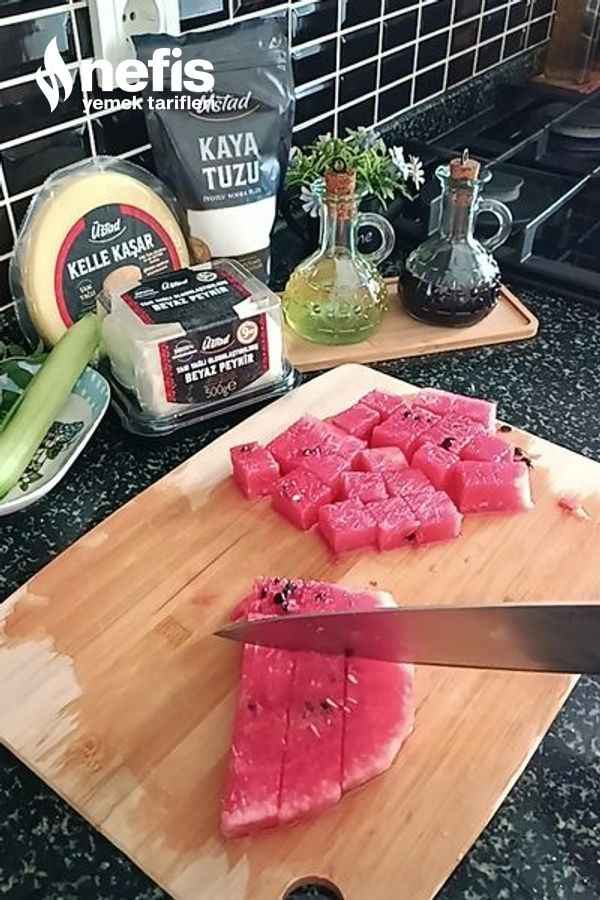 - Karpuzu soyup küpler halinde doğrayın ,peyniri karpuz küplerinin büyüklüğünde doğrayın.