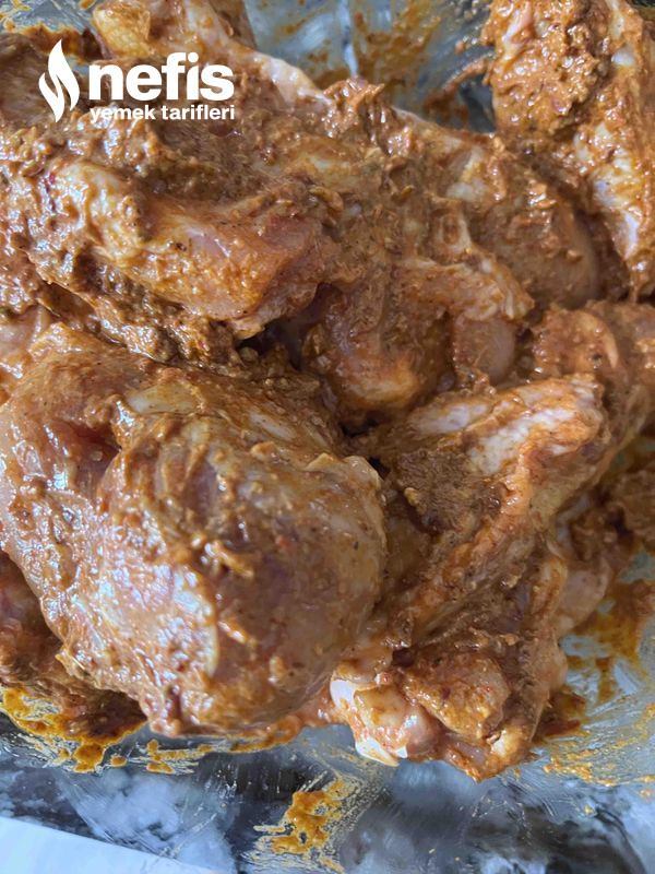 2. Tavuk but ve kanatlara bıçakla çizikler atın ve( isterseniz yalnızca but yahut kanat kullanabilirsiniz)sosa alın ve her yerine gelecek formda sosların ve bir tabağa alın.
