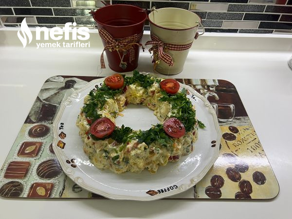 7. Şekilli kap ya da kelepçeli kabın ortasına bardak koyup salatayı kenarlarına koyun. 2 saat dolapta bekletilir.