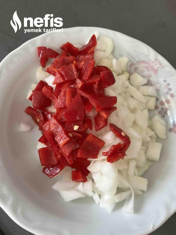 3. Kızaran tavuğa soğan ve kırmızı biber ekleyip ölene kadar pişmeye devam edelim.