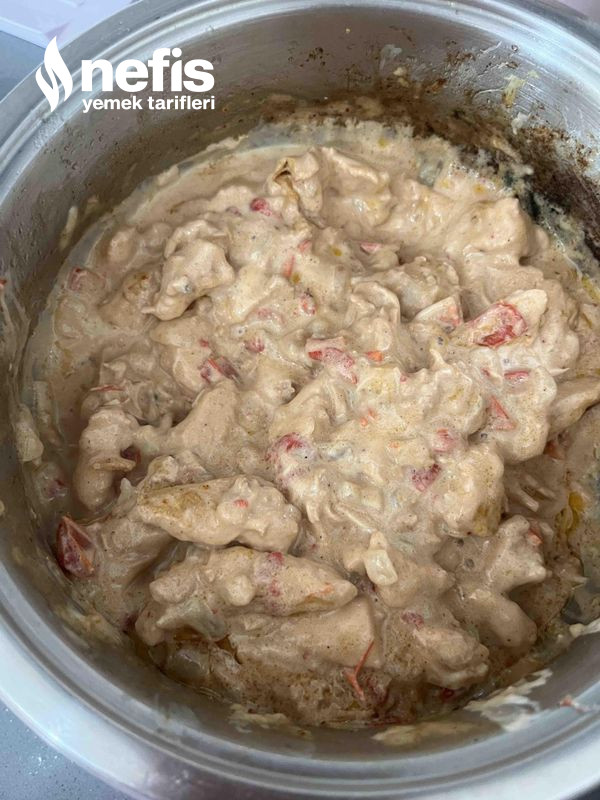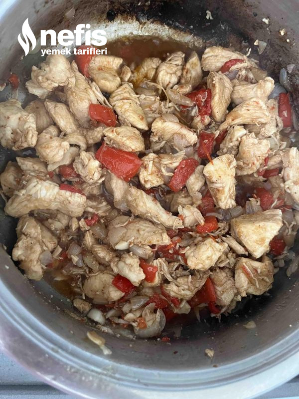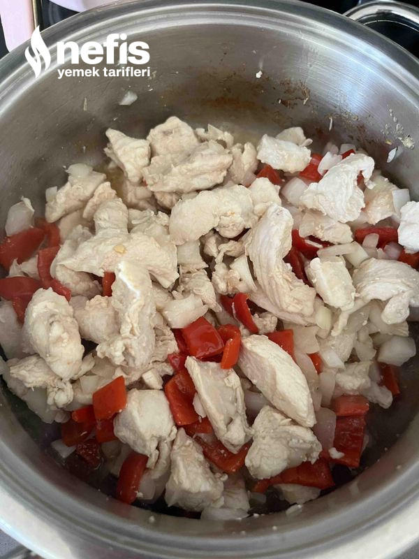 7. Üzerine haşladığınız tavuğu ekleyip karıştıralım.