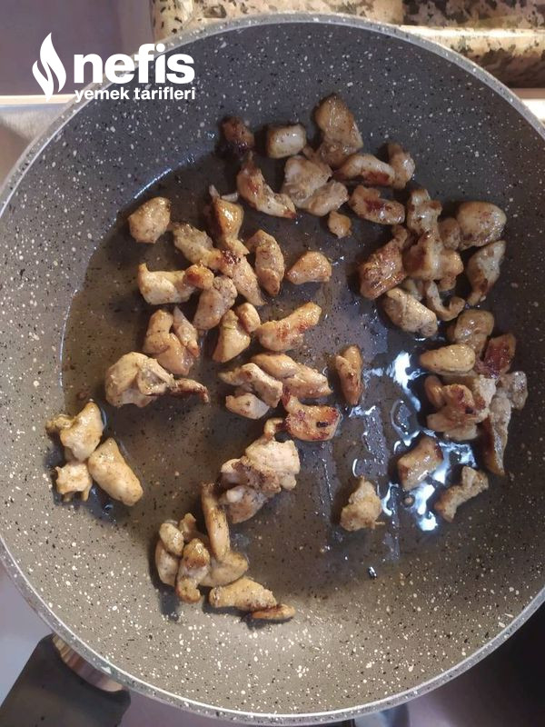 - Tavuklarımızı jülyen doğranıp ocağa alıyoruz. (daha süratli pişmesi için kızgın tavaya hiç yağ eklemeden koyuyoruz.