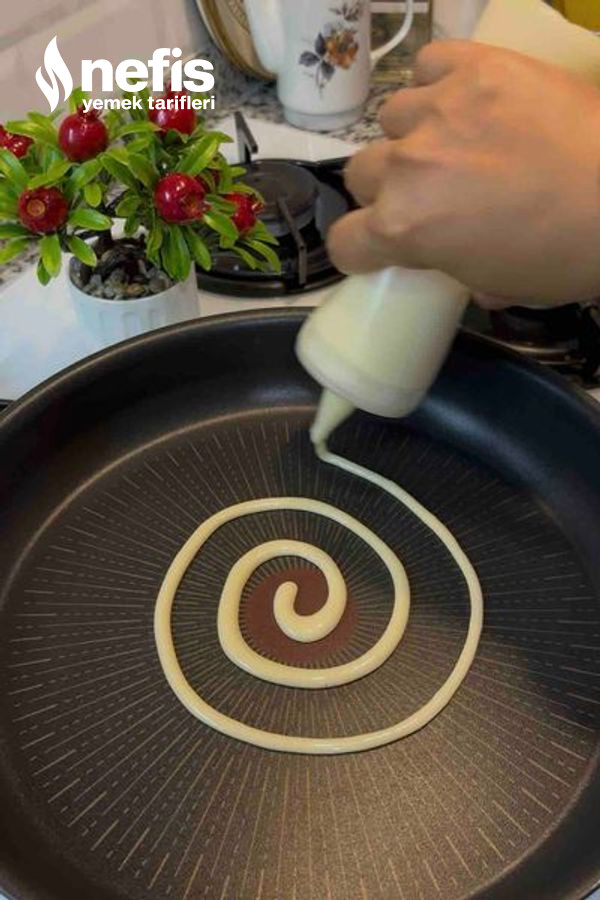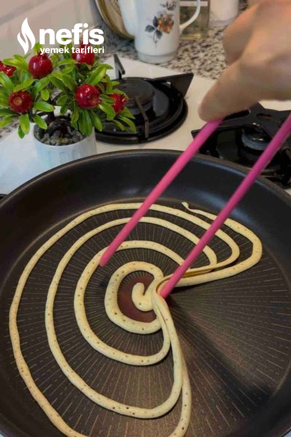 - İyice ısınmış yanmaz yapışmaz tavaya spiral formunda hamuru sıkın, üzeri baloncuk oldu mu yavaşça alın.