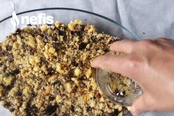 5. Bu ortada tabanı için keki elinizle ufalayın istediğiniz bir borcama yayın çay bardağının altıyla bastırın keki biraz düzeltin ,kremayı üzerine dökün ve güzelce yayın.