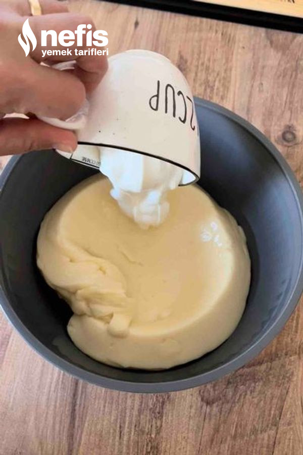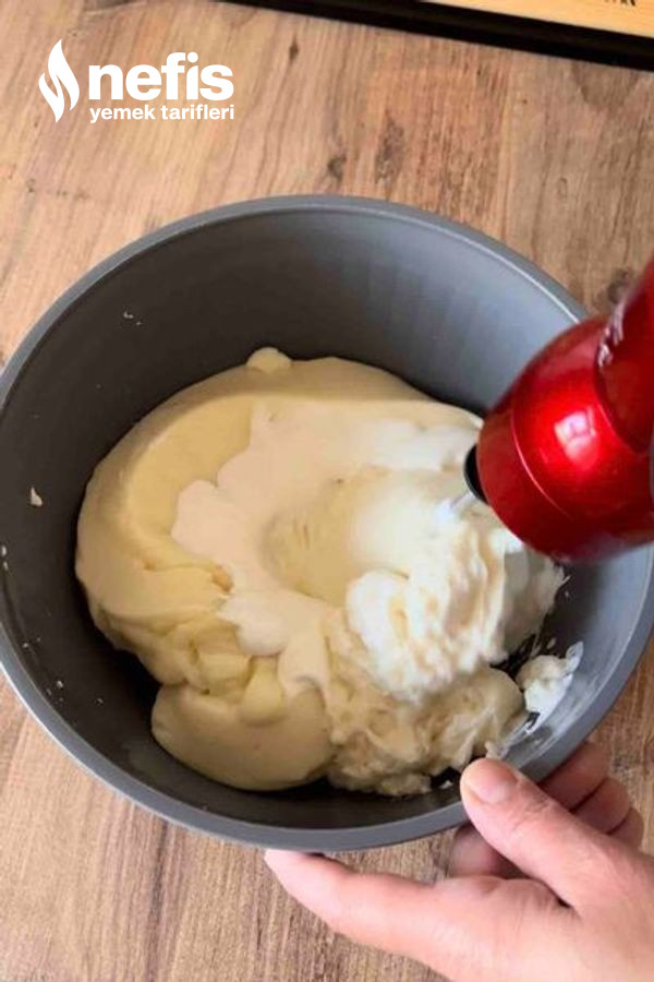 - Buzdolabında soğuyan kremayı çıkarıp üzerine sıvı kremayı ekleyin. Mikserle pürüzsüz kıvam alana kadar çırpın.