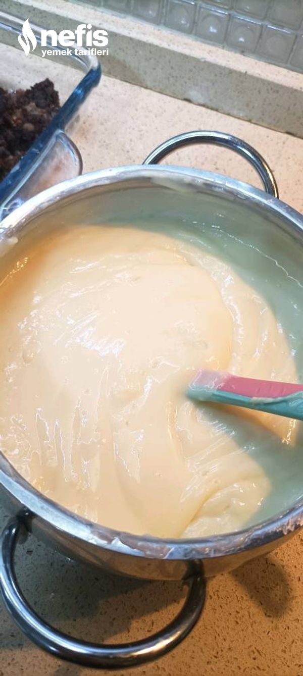 - Muhallebi ılık hale gelince toz krem şanti ve süt ekleyip çırpılır.