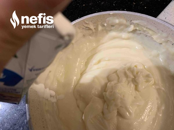 - Soğuyan muhallebinin içine krema ve krem şantiyi ekleyip pürüzsüz bir kıvam alana kadar çırpalım.