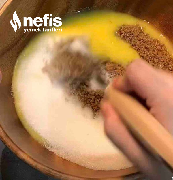 - Tereyağını yeterlice eritip, iki çeşit şekeri katıp karıştırın (kum üzere görünmesi gerekiyor)